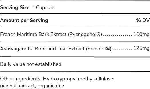 Pycnogenol®, Sensoril® Ashwagandha, Hydroxypropyl methylcellulose, rice hull extract, organic rice